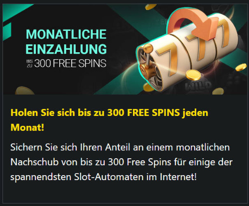 Zweimal monatlich besteht bei 1Bet die Möglichkeit, Einzahlungen ab 20 Euro mit bis zu 100 Free Spins aufzuwerten. Bei der Kampagne handelt es sich um einen Freispiel-Reload Bonus. Die Eingabe des Codes sowie die Einzahlungshöhe entscheiden darüber, wie viele Gratis Spins im Einzelnen gewährt werden.